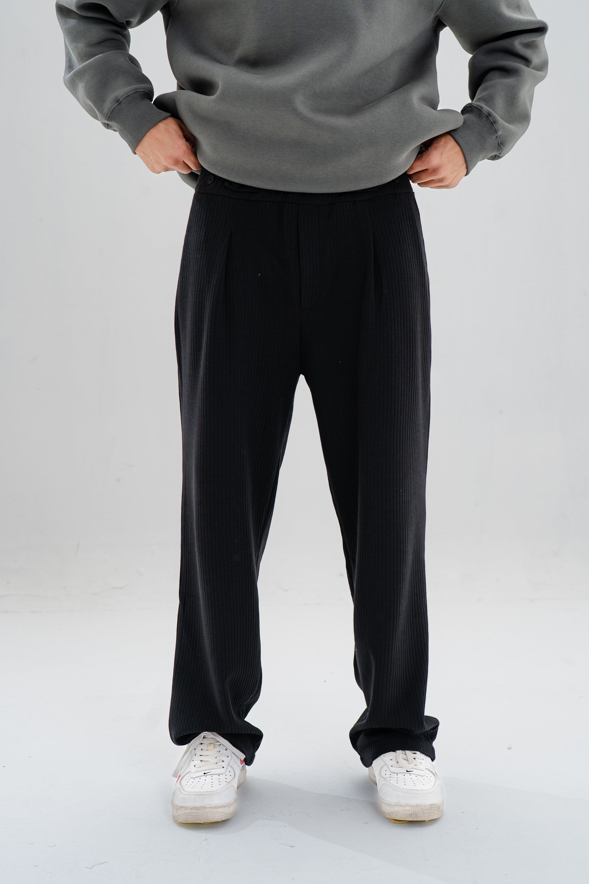 Relaxed-fit jacquard pants with ribbed texture and side button detail.