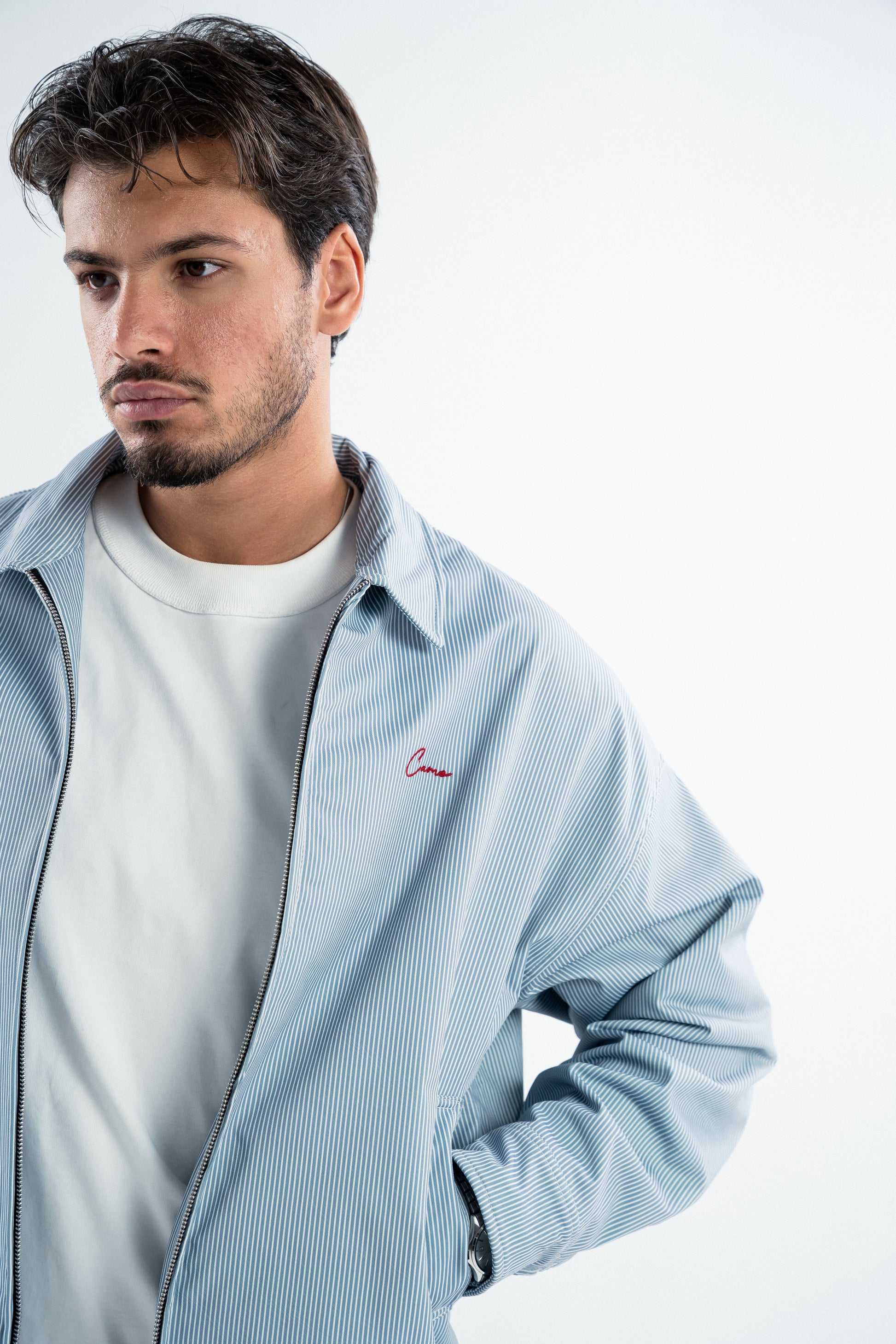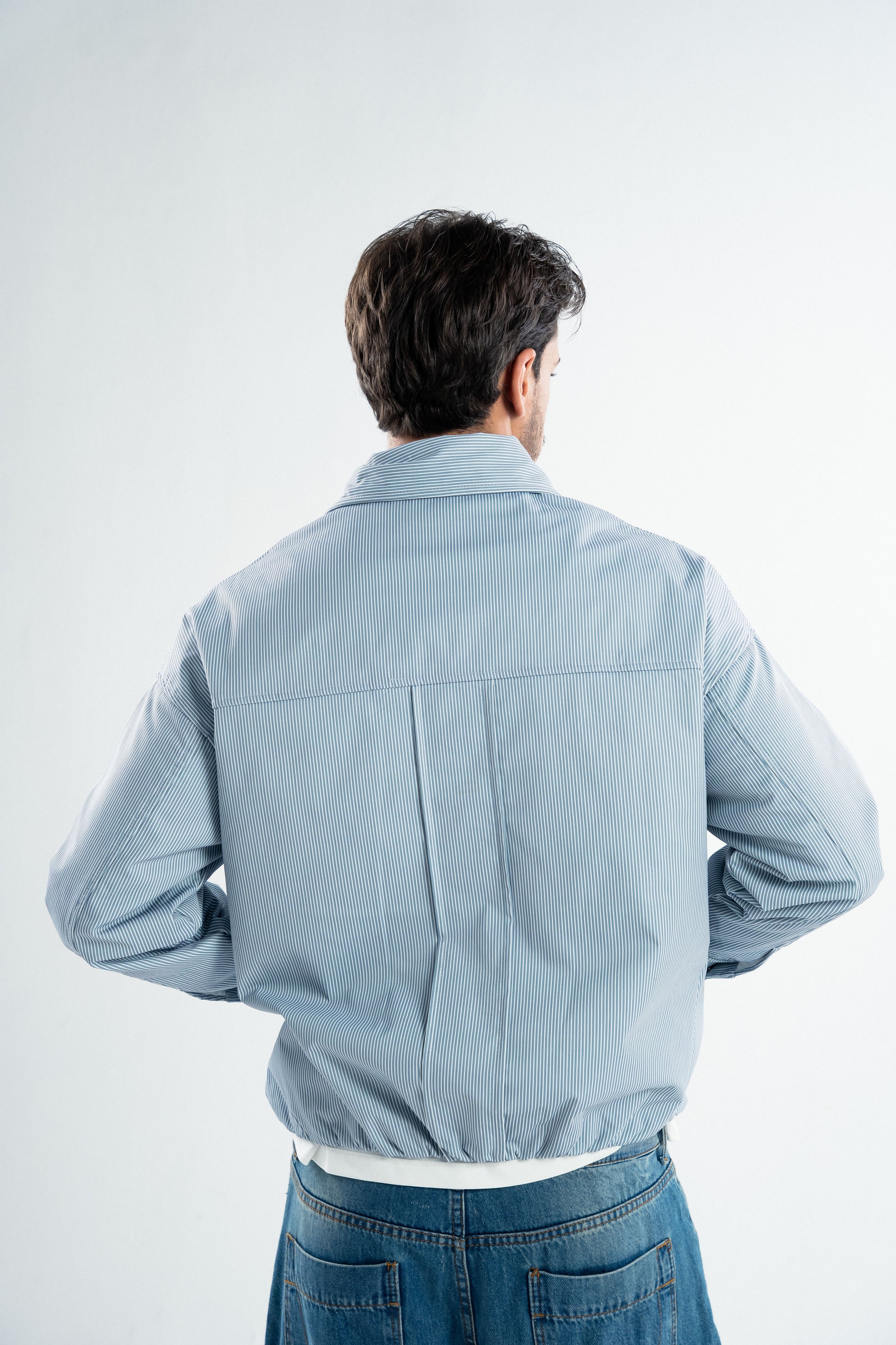 This waterproof jacket features a refined blue-and-white vertical stripe